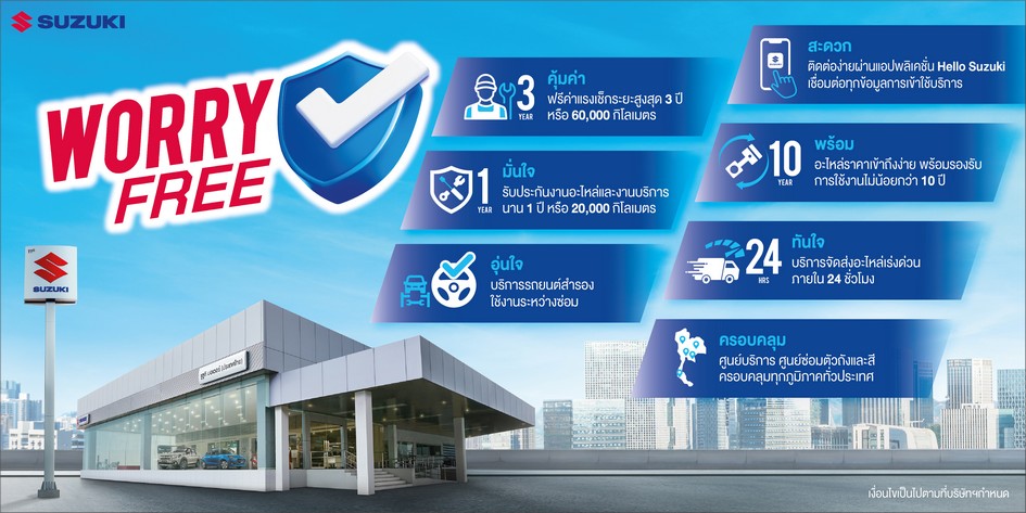 อีกทั้ง ลูกค้ารถยนต์ซูซูกิยังมั่นใจได้ว่า เราจะมอบการดูแลและบริการด้วยคุณภาพและมาตรฐานที่ดีแก่ทุกท่าน ภายใต้แคมเปญ “SUZUKI WORRY FREE” ที่เริ่มมีผลบังคับใช้ตั้งแต่วันที่ 1 สิงหาคม 2567 ที่ผ่านมา โดยประกอบไปด้วยรายละเอียดการดูแลรถยนต์ของลูกค้า ทั้ง 7 หัวข้อดังนี้