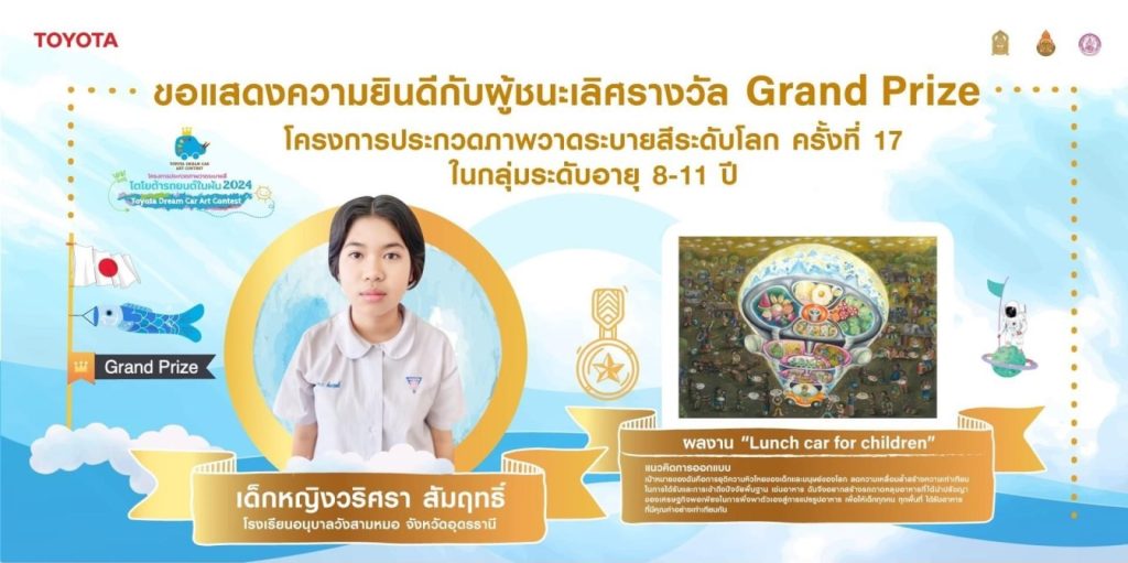 ด.ญ.วริศรา สัมฤทธิ์ อายุ 11 ปี ชั้นประถมศึกษาปีที่ 6 โรงเรียนอนุบาลวังสามหมอ จ.อุดรธานี ได้รับรางวัลชนะเลิศ Grand Prize จากผลงาน “Lunch car for Children” รุ่นอายุ 8 – 11 ปี