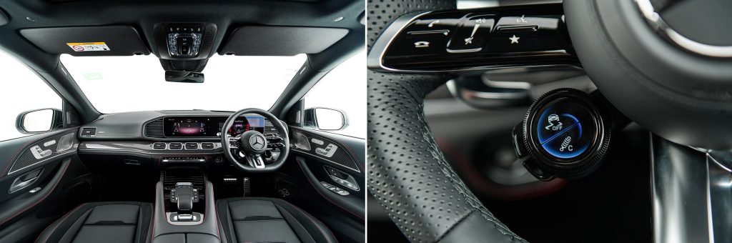ภายในห้องโดยสารมาพร้อม AMG Interior Package มอบรายละเอียดการตกแต่งที่โดดเด่นตามสไตล์สปอร์ตในทุกองค์ประกอบ ไม่ว่าจะเป็น พวงมาลัย AMG Performance steering wheel พร้อมระบบพวงมาลัย AMG Steering 3 สเตจ ติดตั้งเบาะนั่งหุ้มด้วยหนังและไมโครไฟเบอร์ หลังคากระจก Panoramic Sunroof ที่ช่วยเพิ่มความโปร่งสบายให้กับห้องโดยสาร มอบประสบการณ์การขับขี่ที่เหนือกว่าด้วยระบบปฏิบัติการ MBUX7 แบบ zero-layer concept ที่ออกแบบมาตามรูปแบบโปรแกรม AMG ไม่ว่าจะเป็น หน้าจอธีมพิเศษของ AMG รวมถึงการวัดแทร็กสนาม โดยควบคุมผ่านจอกลางแบบ widescreen cockpit ขนาด 12.3 นิ้ว ที่เชื่อมต่อกับ AMG Head-up Display ขนาด 12.3 นิ้ว ติดตั้งระบบนำทางแสดงภาพเสมือนจริง MBUX augmented reality for navigation และระบบเสียง Burmester® surround sound system ลำโพง 13 ตัว กำลังขับ 590 วัตต์ พร้อม Dolby Atmos® ช่วยมอบเสียงเพลงที่คมชัดสมจริงรอบทิศทางราวกับอยู่ในสตูดิโอ