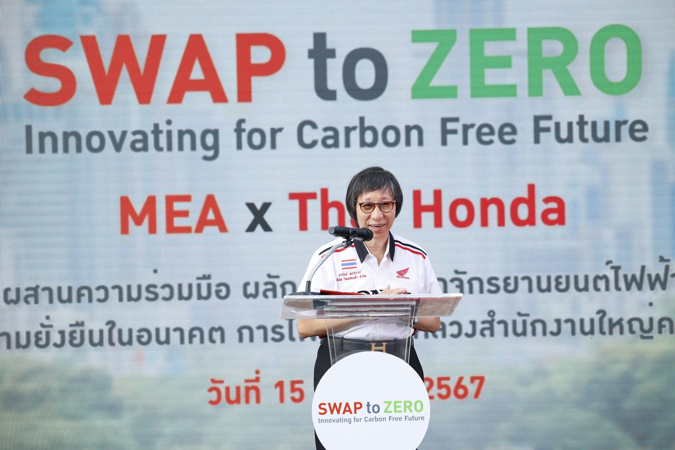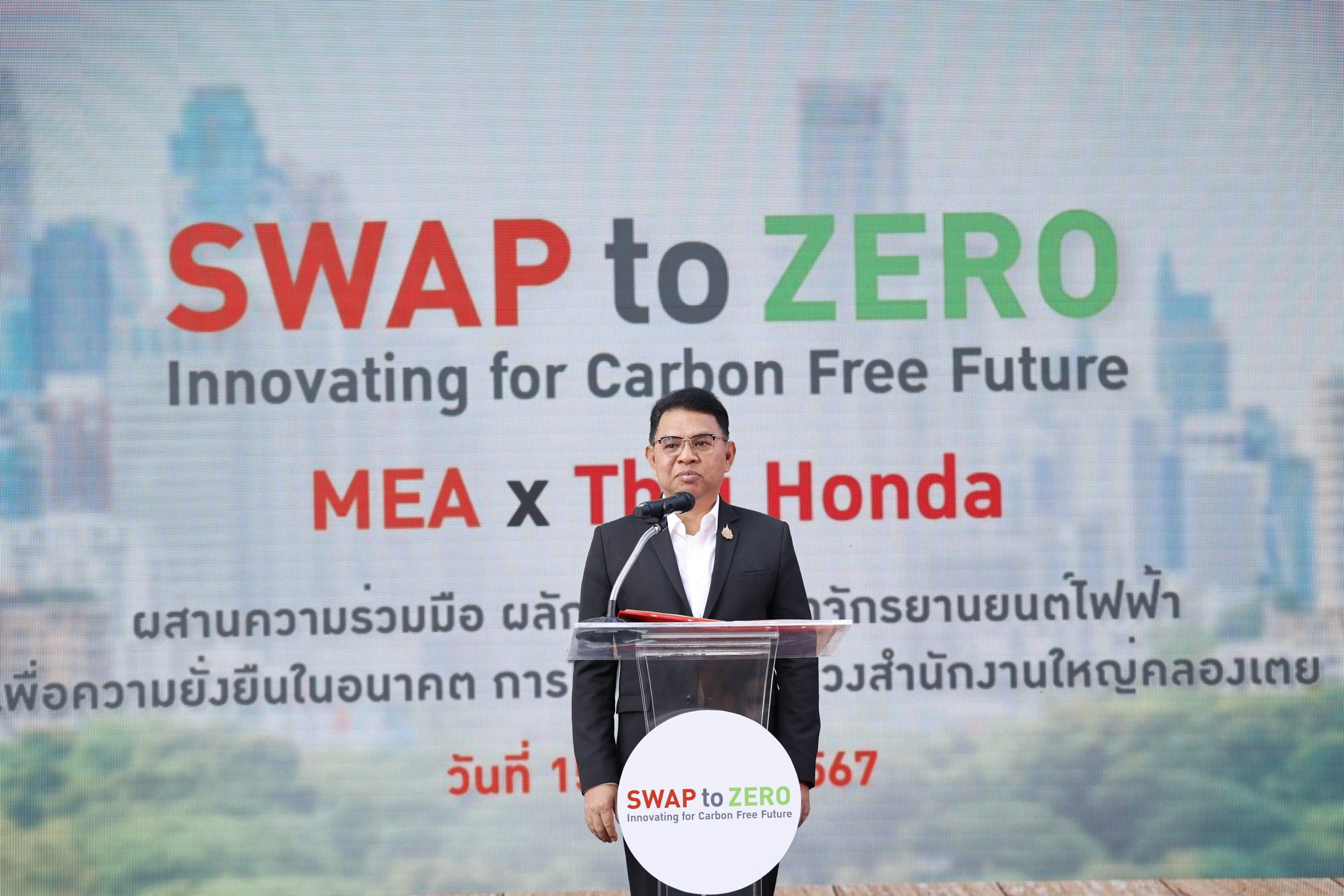 นายวิลาศ เฉลยสัตย์ ผู้ว่าการ MEA หรือการไฟฟ้านครหลวง เป็นประธาน เปิดงาน SWAP to ZERO: Innovating for Carbon-free future ร่วมด้วย ดร.อารักษ์ พรประภา ประธาน บริษัท ไทยฮอนด้า จำกัด ประกาศความร่วมมือใน “โครงการร่วมมือศึกษาความเป็นไปได้ทางธุรกิจ และทดลองการให้บริการสถานีสับเปลี่ยนแบตเตอรี่ ระหว่าง การไฟฟ้านครหลวง และ บริษัท ไทยฮอนด้า จำกัด ที่ได้ร่วมกันพัฒนาแนวทางความเป็นไปได้ และรูปแบบการศึกษาวิจัยทดลองเพื่อผลักดันให้เกิดการใช้งานรถจักรยานยนต์ไฟฟ้าในประเทศไทยอย่างยั่งยืนในอนาคต ณ สถานีสับเปลี่ยนแบตเตอรี่ การไฟฟ้านครหลวง (สำนักงานใหญ่) คลองเตย