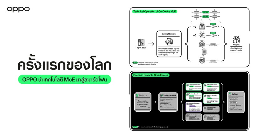 OPPO บริษัทสมาร์ตโฟนชั้นนำระดับโลกก้าวสู่ความสำเร็จครั้งสำคัญด้วยการเป็นบริษัทแรกที่นำเทคโนโลยี Mixture of Experts (MoE) มาใช้บนมือถือ ซึ่งช่วยยกระดับประสิทธิภาพการประมวลผล AI ทำให้เกิดโอกาสใหม่ในการพัฒนา AI บนอุปกรณ์ให้มีความล้ำหน้า และยืดหยุ่นมากขึ้น และปูทางสำหรับนวัตกรรมในอนาคตเกี่ยวกับการรวม AI เข้ากับฮาร์ดแวร์มือถือ