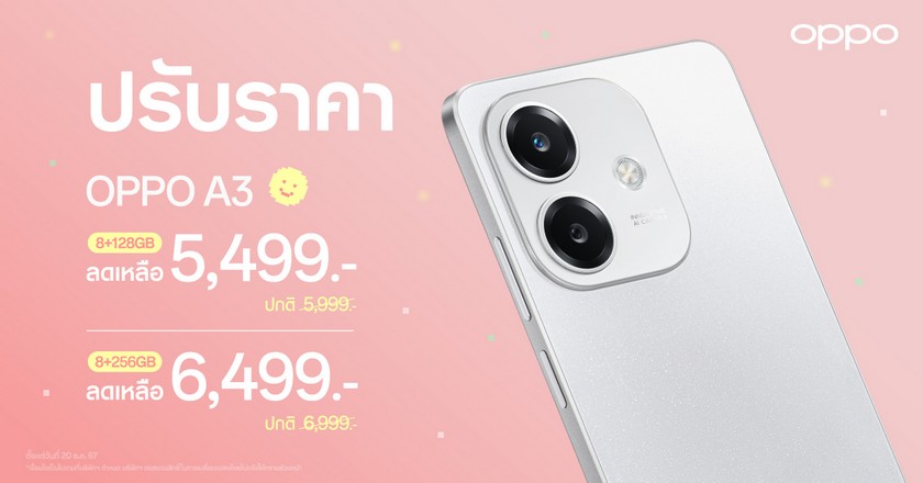 OPPO A3 เอาใจสายโหด พร้อมตอบโจทย์ทุกเอนเตอร์เทน มาในราคาใหม่สุดคุ้ม เริ่มต้นเพียง 5,499 บาท เท่านั้น!