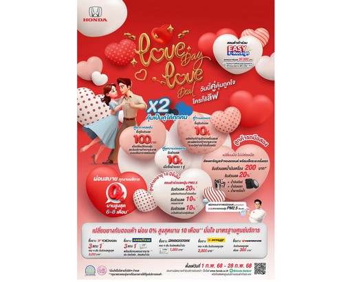 บริษัท ฮอนด้า ออโตโมบิล (ประเทศไทย) จำกัด จัดแคมเปญสุดพิเศษ “Love Day, Love Deal คุ้มถูกใจ คู่ไหนก็เลิฟ”* ส่งมอบความรักความห่วงใยให้ลูกค้าในช่วงเทศกาลแห่งความรักวันวาเลนไทน์ มอบส่วนลดพิเศษ 10% หรือส่วนลด 100 บาท เมื่อลูกค้าซื้ออะไหล่หรือผลิตภัณฑ์แบบคู่* สุดคุ้ม พร้อมมอบส่วนลดอะไหล่พิเศษ 20% สำหรับลูกค้ารถยนต์ฮอนด้าอายุ 10 ปีขึ้นไป เพื่อสู้ปัญหาฝุ่น PM2.5 โดยสามารถเลือกผ่อนชำระค่าใช้จ่ายงานบริการ 0% นานสูงสุด 8 เดือน และยางรถยนต์ผ่อนชำระนานสูงสุด 10 เดือน** เมื่อนำรถยนต์เข้ารับบริการที่ศูนย์บริการฮอนด้าทั่วประเทศ ตั้งแต่วันที่ 1 – 28 กุมภาพันธ์ 2568