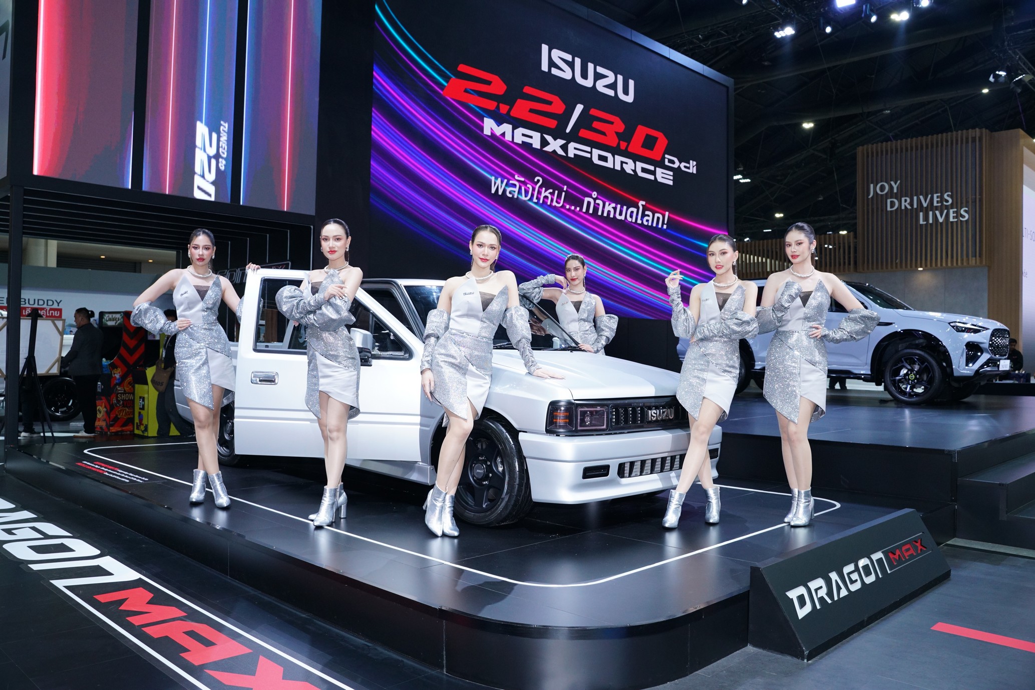 - รถปิกอัพในตำนาน “ISUZU DRAGONMAX” สร้างขึ้นใหม่ภายใต้คอนเซ็ปต์ “Restromod” (Restoration & Modernization) เพื่อตอกย้ำแนวคิด “Isuzu Trusted Buddy… อีซูซุเคียงข้างคุณ เคียงคู่ไทย” โดยนำรถปิกอัพอีซูซุยอดนิยม รุ่น TFR ปี 1988 มาปรับลุคใหม่ เสริมสไตล์สปอร์ต ทันสมัย โดดเด่นภายนอกจดภายใน ใหม่หมดทุกมุมมอง ดีไซน์กันชนหน้า กระจังหน้า ฝากระโปรงหน้าใหม่ ไฟหน้าโปรเจคเตอร์ใหม่แบบ LED พร้อมไฟ DRL ที่กันชนหน้า ชุดสเกิร์ตข้างดีไซน์ใหม่แบบ Muscle Line ที่ซุ้มล้อ ฝากระบะท้ายพร้อมสปอยเลอร์ Duck Tail ดีไซน์ใหม่ ดุดันยิ่งขึ้นด้วยโป่งล้อที่แก้มหน้าและกระบะท้ายแบบ Wide Body กระจกมองข้าง ปรับไฟฟ้า สะกดสายตาด้วยชุดไฟท้าย LED ใหม่ ทันสมัยกับสีตัวรถ Katana Matte Silver เปลี่ยนระบบช่วงล่างพร้อมระบบบังคับเลี้ยวใหม่ ด้วยชุดแร็คพวงมาลัย ปีกนก คอม้า และเพลาท้ายใหม่ ชุดโช้กอัพ Profender รุ่น Queen Series & Piggy Back ล้อแม็กซ์ Bradley-V ขนาด 8×17 นิ้ว ยาง Yokohama Advan Fleva V701 ขนาด 225/50/17 ชุดจานดิสก์เบรกหน้า-หลัง Brembo พร้อมจานเบรกขนาด 340 และ 320 มม. ภายในเพิ่มความหรูหราแฝงรสนิยมขั้นสุดกับห้องโดยสารด้วยคอนโซลหน้า เบาะและชุดแต่งอาคันทาร่ายกเซต เสริมความสปอร์ตด้วยเบาะ Recaro Premium Classic Seat หุ้มอาคันทาร่า พร้อมมาตรวัด AIM MXT ขนาด 10 นิ้ว อ่านค่าความเร็ว วัดรอบเครื่องยนต์ วัดระดับน้ำมันเชื้อเพลิง วัดความร้อนเครื่องยนต์ ติดตั้งจอกลางแบบ Android ขนาด 8 นิ้ว วัดค่าฟังก์ชั่นต่าง ๆ จากกล่องพ่วงเพิ่มแรงม้า ECU Shop Ultra Boost เช่น วัดบูสต์เทอร์โบ วัดแรงดันน้ำมันเชื้อเพลิง และอุณหภูมิภายนอก ผสานเข้ากับที่สุดของขุมพลังดีเซลแห่งอนาคต “ใหม่! 2.2 Ddi MAXFORCE…The FORCE of FUTURE พลังใหม่…กำหนดโลก” ห้องเครื่องสร้างใหม่โดย BRD เพิ่มความแรงเต็มสปีด แรงไร้ควันด้วยกล่องพ่วงเพิ่มแรงม้า ECU SHOP Ultra Boost ปรับจูน 220 แรงม้า แรงบิด 550 นิวตัน-เมตร และคันเร่งไฟฟ้า Boost Speed Next