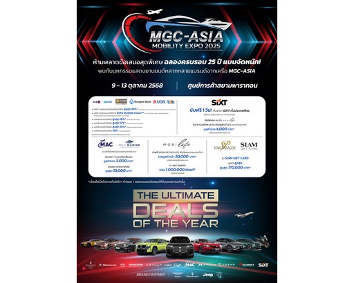 บริษัท มิลเลนเนียม กรุ๊ป คอร์ปอเรชั่น (เอเชีย) จำกัด (มหาชน) หรือ MGC-ASIA ผู้นำธุรกิจไลฟ์สไตล์โมบิลิตี้ครบวงจร จัดงานใหญ่ประจำปี ‘MGC-ASIA MOBILITY EXPO 2025’ ยกทัพยนตรกรรมในเครือ ครบทุกแบรนด์ จัดแสดงให้ลูกค้าได้สัมผัสอย่างใกล้ชิด พร้อม ‘The Ultimate Deals of the Year’ ข้อเสนอพิเศษแห่งปีที่ยากจะปฏิเสธ ระหว่างวันที่ 9-13 ตุลาคม 2568 ที่ศูนย์การค้าสยามพารากอน