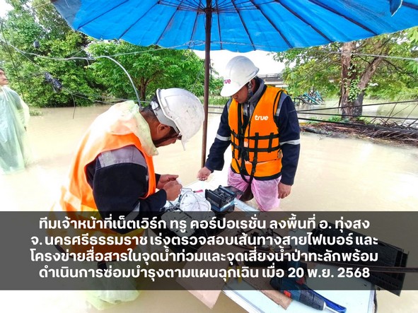 นอกจากนี้ ทรู คอร์ปอเรชั่น ยังมีมาตรการฉุกเฉินเสริมความพร้อมเครือข่าย ได้แก่ การเตรียมเครื่องปั่นไฟ น้ำมันสำรอง และแบตเตอรี่สำรองให้สถานีฐานในพื้นที่เสี่ยงไฟฟ้าดับจากน้ำท่วมโดยเฉพาะหาดใหญ่ การจัดรถโมบายล์สถานีฐานเคลื่อนที่เร็ว (Cell on Wheels: COW) เสริมสัญญาณในจุดวิกฤต การเตรียมรถ 4WD และเรือท้องแบนเข้าถึงพื้นที่ประสบภัย การจัดทีมซ่อมบำรุงฉุกเฉินพร้อมอุปกรณ์สำรองดูแลระบบสื่อสารให้ทำงานต่อเนื่อง การประสานงานกับหน่วยงานรัฐและเอกชนเพื่อสนับสนุนการช่วยเหลือประชาชน และการใช้ศูนย์ปฏิบัติการเครือข่ายอัจฉริยะ BNIC ร่วมกับระบบ AI Network Monitoring ดูแลและบริหารเครือข่ายตลอด 24 ชั่วโมง