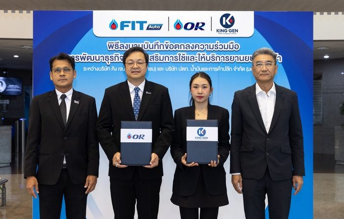 คุณรชา อุทัยจันทร์ รองประธานเจ้าหน้าที่บริหารด้านธุรกิจหล่อลื่น บริษัท ปตท. น้ำมันและการค้าปลีก จำกัด (มหาชน)(OR) พร้อมด้วย คุณพรทิพย์ ตรงกิ่งตอน ประธานกรรมการบริหารและประธานเจ้าหน้าที่บริหาร และ คุณอภิชาติ เพียรเจริญ กรรมการบริหารและรองประธานเจ้าหน้าที่บริหาร บริษัท คิง เจน จำกัด (มหาชน) ลงนามในบันทึกข้อตกลงความร่วมมือทางธุรกิจ (MOU) ระหว่าง ศูนย์บริการยานยนต์ FIT Auto และ KING GEN เพื่อพัฒนาและส่งเสริมการใช้ รวมถึงการให้บริการยานยนต์ไฟฟ้า (EV) อย่างครบวงจร โดยจะร่วมกันศึกษาและพัฒนาธุรกิจด้านการตรวจสอบและซ่อมบำรุงยานยนต์ไฟฟ้า (EV After-Sales Service Point) เพื่อยกระดับมาตรฐานการให้บริการ สร้างความเชื่อมั่นให้ลูกค้า และวางรากฐานสู่การขยายเครือข่ายบริการยานยนต์ไฟฟ้าในอนาคต