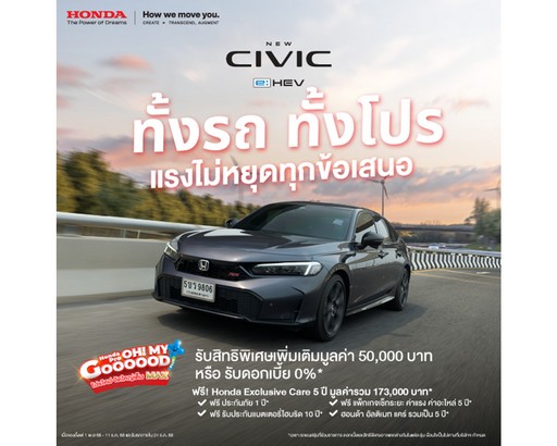 บริษัท ฮอนด้า ออโตโมบิล (ประเทศไทย) จำกัด จัดโปรแรงส่งท้ายปีกับแคมเปญ “Honda Pro OH! MY GOOOOOD PLUS+” เพิ่มเติมทางเลือกใหม่สำหรับรถยนต์สองรุ่นฮิตในไลน์อัป Honda e:HEV – The EXCITING Hybrid ทั้ง Honda Civic e:HEV และ New Honda HR-V e:HEV มอบความคุ้มค่าที่ “ตรงใจ เลือกได้เอง” ให้คุณเลือกได้ดั่งใจรับสิทธิพิเศษเพิ่มเติมมูลค่า 50,000 บาท หรือ เลือกรับดอกเบี้ยพิเศษ 0% พร้อมรับ Honda Exclusive Care 5 ปี มูลค่าสูงสุด 173,000 บาท** ให้การเป็นเจ้าของรถยนต์ทั้งสองรุ่นเป็นเรื่องง่ายกว่าที่เคย สำหรับลูกค้าที่จองรถยนต์ตั้งแต่วันที่ 1 พฤศจิกายน 2568 – 11 ธันวาคม 2568 และรับรถภายในวันที่ 31 ธันวาคม 2568 อย่าพลาด! โปรแรงแห่งปีที่ทำให้ความฝันของคุณเป็นจริง