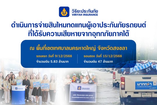 “บริษัทฯ ได้เร่งดำเนินการจ่ายสินไหมทดแทนให้แก่ลูกค้าที่ได้รับผลกระทบอย่างต่อเนื่อง ทั้งนี้ ตามรายงานของศูนย์ปฏิบัติการสินไหมทดแทนวิริยะประกันภัยในพื้นที่ภาคใต้ ณ ปัจจุบัน มีรถยนต์ที่ได้รับความเสียหายจากน้ำท่วมประมาณ 4,300 คัน โดยพื้นที่ที่ได้รับผลกระทบมากที่สุด คือ เขตเทศบาลนครหาดใหญ่ จำนวน 3,800 คัน บริษัทฯ จึงได้ระดมเจ้าหน้าที่ดำเนินงานเร่งรัดตรวจสอบและพิจารณาเอกสารประกอบการเคลมทุกวัน ตลอด 24 ชั่วโมง โดยเบื้องต้นบริษัทฯ ได้ดำเนินการจ่ายสินไหมทดแทนให้แก่ผู้เอาประกันภัย รอบแรก ณ วันที่ 9 ธันวาคม 2568 เป็นการคืนทุนประกันภัยเต็มจำนวนตามที่ระบุไว้ในกรมธรรม์ ซึ่งเป็นรถสันดาปทั้งหมด เป็นเงินจำนวน 5.83 ล้านบาท รอบถัดไปในวันที่ 15 ธันวาคม 2568 สำหรับเคสที่มีเอกสารประกอบการเรียกร้องค่าสินไหมทดแทนครบถ้วน เป็นเงินจำนวน 47 ล้านบาท และจนถึงสิ้นปี 2568 คาดว่าจะจ่ายสินไหมฯ แล้วเสร็จ โดยบริษัทฯ ขอยืนยันความมุ่งมั่นในการดูแลผู้เอาประกันภัยทุกท่านให้ได้รับการชดเชยอย่างครบถ้วน รวดเร็ว และเป็นธรรมสูงสุด” คุณณัฐพงศ์กล่าว