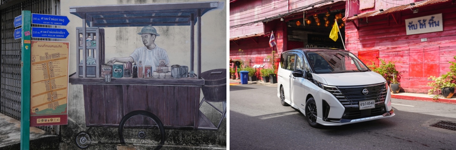 ปิดท้ายทริปด้วยการแวะบ้านนครในและโซน Street Art เมืองเก่า ที่มีงานศิลปะกระจายอยู่ตามกำแพงให้ค่อย ๆ เดินชมและเก็บภาพระหว่างจอดรถ อีกหนึ่งจุดที่ไม่ควรพลาดคือโรงสีแดง หับ โห้ หิ้น อาคารสีแดงอายุกว่าศตวรรษที่ครั้งหนึ่งเคยเป็นโรงสีข้าวสำคัญของภาคใต้ และปัจจุบันถูกปรับเป็นพิพิธภัณฑ์และพื้นที่เรียนรู้ของชุมชน บรรยากาศของพื้นที่เหล่านี้ยิ่งเดินยิ่งเพลิน ขับเข้า–ออกหลายรอบก็ไม่รู้สึกลำบาก เพราะมีผู้ช่วยส่องรอบตัวของเซเรน่าคอยดูมุมอับและเตือนรถสวน ทำให้การหาที่จอดในซอยแคบ การวนรถดูงานศิลปะ หรือการถอยจอดหน้าโรงสีแดงเป็นเรื่องง่ายไปหมด ตลอดทั้งวันจึงขับเที่ยวได้แบบสบาย ๆ ไม่ต้องกังวลกับความแออัดหรือพื้นที่จอดจำกัด