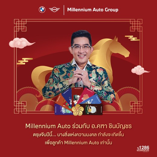 เสริมพลังแห่งโชคลาภ ต้อนรับปีม้าทอง ด้วยบรรยากาศโชว์รูมที่ตกแต่งอย่างประณีตตามศาสตร์มงคลตรุษจีน และยังได้รับเกียรติจาก อาจารย์คฑา ชินบัญชร ร่วมสร้างสรรค์คอนเทนต์มงคลผ่าน Lucky Mobile Wallpaper (ยันต์ดิจิทัลมหามงคล) ออกแบบเฉพาะตามวันเกิดทั้ง 7 วัน ถ่ายทอดแนวคิดเรื่องโชคลาภ ความสำเร็จและการเริ่มต้นปีใหม่อย่างมีพลัง และวิดีโอคอนเทนต์พิเศษ ถ่ายทอดแนวคิดเรื่องโชคลาภ ความสำเร็จ เพื่อมอบเป็นของขวัญแก่ลูกค้า บีเอ็มดับเบิลยู มิลเลนเนียม ออโต้ โดยสามารถติดตามรับชม หรือดาวน์โหลดยันต์ดิจิทัลมหามงคลได้จากโซเชียลมีเดียของ บีเอ็มดับเบิลยู มิลเลนเนียม ออโต้ ทุกช่องทาง