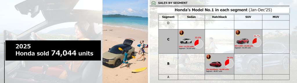ทั้งนี้ ฮอนด้า ยังสามารถครองอันดับ 1 ใน 3 เซกเมนต์หลักของตลาดรถยนต์นั่ง ได้แก่