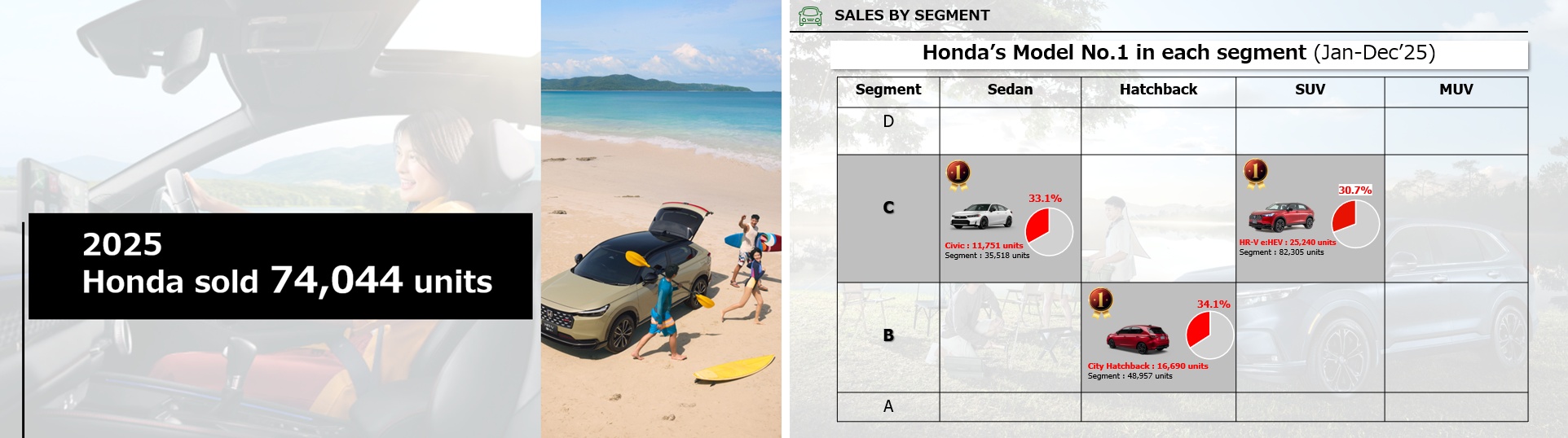 ท่ามกลางความท้าทายทางเศรษฐกิจ ฮอนด้ายังคงได้รับความไว้วางใจจากผู้บริโภคชาวไทย โดยมียอดจำหน่ายรถยนต์สะสมปี 2568 รวม 74,044 คัน (นับรวมกลุ่มรถยนต์อเนกประสงค์ของฮอนด้า) ครองอันดับ 2 ในตลาด ครองส่วนแบ่งทางการตลาดรถยนต์นั่งที่ 18% และมียอดจำหน่ายกลุ่มยานยนต์ไฟฟ้า (xEV) ในตลาดรถยนต์ สูงถึง 55,495 คัน ครองส่วนแบ่งทางการตลาดราว 20% ซึ่งยอดจำหน่ายหลักมาจากรถยนต์ในไลน์อัป e:HEV – The EXCITING Hybrid