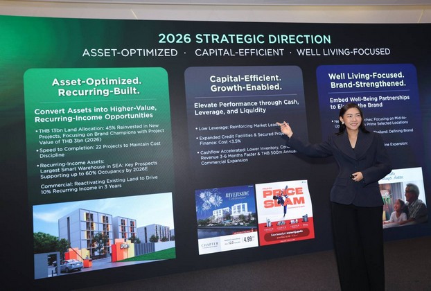 ในมิติแรก “Asset-Optimized, Recurring-Built” บริษัทฯ เดินหน้ากลยุทธ์เชิงรุกเพื่อเพิ่มสัดส่วนรายได้ประจำ (Recurring Income) ผ่านการบริหารจัดการพอร์ตที่ดินมูลค่ากว่า 12,800 ล้านบาท เปลี่ยนสินทรัพย์ให้เป็นรายได้ผ่านการพัฒนาโครงการที่อยู่อาศัยและการสร้างรายได้จากการเช่ารูปแบบใหม่ ๆ อาทิ กลุ่มเฮลท์แคร์, อะพาร์ตเมนต์, ไฮบริด เรสซิเด้นท์ และคลังสินค้า พร้อมกันนี้ บริษัทฯ ได้วางโรดแมปเร่งสปีดการพัฒนาและการโอนกรรมสิทธิ์ โดยตั้งเป้าปิดโครงการรวม 22 โครงการ เพื่อเพิ่มประสิทธิภาพการบริหารจัดการต้นทุนและลดภาระในการดูแลสินค้าคงคลังอย่างเป็นระบบ สำหรับความคืบหน้าในธุรกิจคลังสินค้า “โอเมก้า บางนา โลจิสติกส์ แคมปัส” ซึ่งเป็นคลังสินค้าอัจฉริยะบนพื้นที่กว่า 217,000 ตารางเมตร ที่ถือเป็นหนึ่งในคลังสินค้าขนาดใหญ่ที่สุดในภูมิภาคเอเชียตะวันออกเฉียงใต้  โดยพัฒนาร่วมกับพันธมิตรระดับโลก  เพื่อรองรับศักยภาพด้านโลจิสติกส์ การกระจายสินค้า และสอดรับกับแนวโน้มเศรษฐกิจยุคใหม่ บริษัทฯ จะเริ่มรับรู้รายได้ในไตรมาส 3 พร้อมได้รับความเชื่อมั่นจากพันธมิตรรายใหญ่ในกลุ่มโลจิสติกส์และอีคอมเมิร์ช โดยคาดว่าจะมียอดจองพื้นที่กว่า 60%  ขณะเดียวกันบริษัทฯ ได้นำที่ดินจากพอรต์ที่มีอยู่มาพัฒนาโครงการ และเพิ่มสัดส่วนบ้านในเซ็กเมนต์กลางถึงบน เพื่อสร้างกระแสเงินสดหมุนเวียน สำหรับรองรับการขยายตัวของธุรกิจในอนาคตได้อย่างมีประสิทธิภาพ