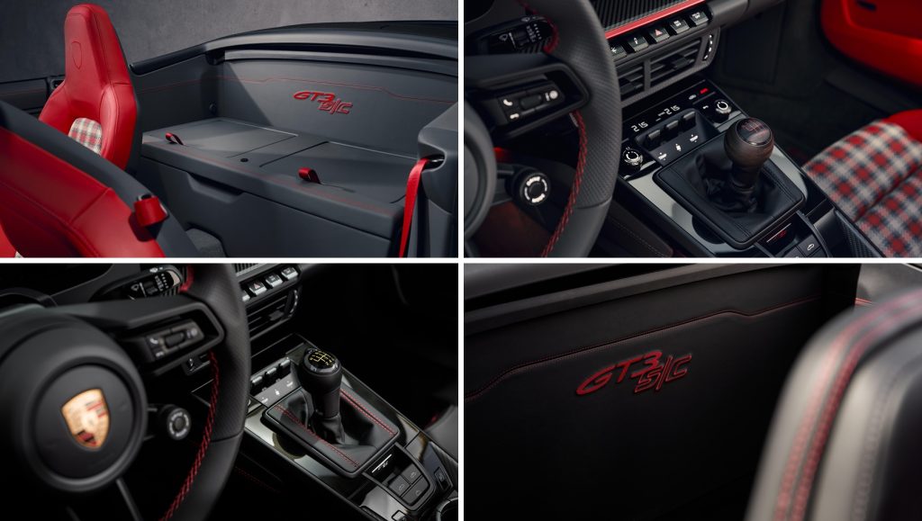 คันเกียร์โทนสีเข้มโดดเด่นทั้งในด้านการออกแบบและสัมผัส พร้อมกับหัวเกียร์ไม้ลามิเนตและลายผังเกียร์ในสี Pyro Red พร้อมสัญลักษณ์ GT3 S/C ใต้คันเกียร์ แถบตกแต่งบนแผงแดชบอร์ด และสัญลักษณ์ 911 ในฝั่งผู้โดยสารก็ตกแต่งด้วยสี Pyro Red เช่นกัน นอกจากนี้ปอร์เช่ ดีไซน์ (Porsche Design) ยังได้นำเสนออุปกรณ์เสริมที่ออกแบบมาเพื่อเติมเต็มแพ็กเกจ Street Style อีกด้วย