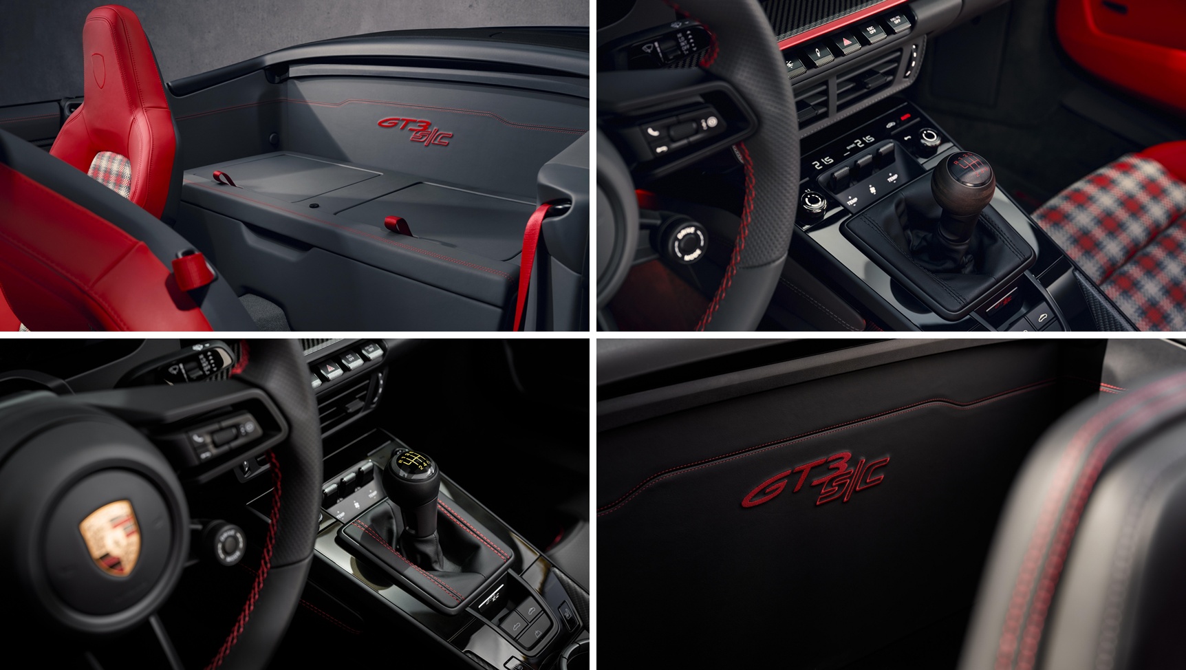ห้องโดยสารมาพร้อมพรมและแผงประตูน้ำหนักเบา พร้อมมือจับแบบคาร์บอนไฟเบอร์ ซึ่งถ่ายทอดมาจาก 911 S/T โดย 911 GT3 S/C ติดตั้งเบาะ 2 ที่นั่งแบบ Sports Seats Plus ปรับไฟฟ้า 4 ทิศทางเป็นอุปกรณ์มาตรฐาน และลูกค้ายังสามารถเลือกติดตั้งเบาะสปอร์ตน้ำหนักเบาพร้อมพนักพิงพับได้และโครงเบาะคาร์บอนไฟเบอร์ โดยเบาะสปอร์ตแบบพับได้นี้มาพร้อมกับถุงลมนิรภัยป้องกันบริเวณทรวงอก ปรับความสูงด้วยระบบไฟฟ้า และตำแหน่งหน้า-หลังแบบปรับมือ อีกทั้งยังสามารถเลือกติดตั้งระบบทำความร้อนเบาะนั่ง 3 ระดับ ภายในหุ้มด้วยหนังสีดำเป็นอุปกรณ์มาตรฐาน ครอบคลุมถึงแผงบังแดดและเสา A พร้อมปักโลโก้ GT3 S/C บริเวณแผงกั้นด้านหลัง เบาะที่นั่งตกแต่งด้วยหนังแบบระบายอากาศ เช่นเดียวกับพวงมาลัยที่หุ้มหนังแบบระบายอากาศตามแบบ 911 S/T และเช่นเดียวกับ 911 GT3 รุ่นหลังคาปิดในปัจจุบัน 911 GT3 S/C ใช้สวิตช์สตาร์ทแบบหมุนที่ติดตั้งด้านซ้ายของพวงมาลัยแทนปุ่มกด หน้าจอมาตรวัดดิจิทัลแสดงผลอย่างชัดเจนและใช้งานง่าย โดยโหมด Track Screen จะลดการแสดงผลบนหน้าจอดิจิทัลด้านซ้ายและขวาของมาตรวัดรอบ ให้เหลือเฉพาะข้อมูลสำคัญ เช่น ยาง น้ำมันเครื่อง ระบบหล่อเย็น และระดับเชื้อเพลิง ไฟเปลี่ยนเกียร์ที่อยู่ด้านซ้ายและขวาของมาตรวัดรอบจะช่วยบอกจังหวะเปลี่ยนเกียร์ที่เหมาะสม โดยผู้ขับสามารถปรับหน้าจอให้แสดงรอบเครื่องสูงสุดที่ 9,000 รอบต่อนาทีไว้ที่ตำแหน่ง 12 นาฬิกาได้ตามต้องการ