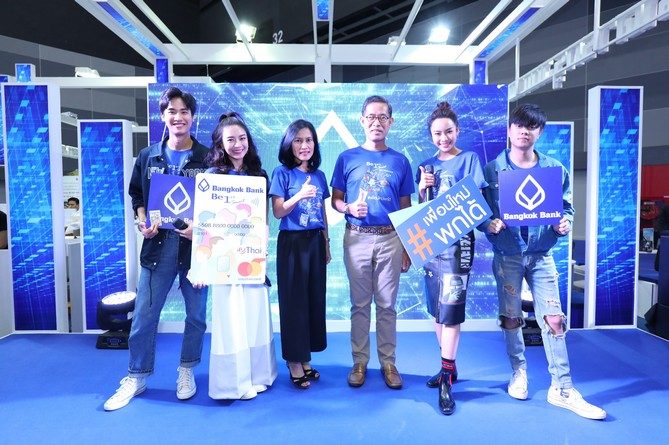 ดร.ทวีลาภ ฤทธาภิรมย์ กรรมการผู้ช่วยผู้จัดการใหญ่ และ นางสาวสุดฤทัย ทองสอง เจ้าหน้าที่บริหารระดับ Senior Vice President บัตรเดบิต-พัฒนาผลิตภัณฑ์ลูกค้าบุคคล สายลูกค้าบุคคล ธนาคารกรุงเทพ จำกัด (มหาชน) พร้อม 4 พรีเซนเตอร์นักแสดงรุ่นใหม่จากค่ายนาดาวบางกอก และจีเอ็มเอ็มทีวี นำโดย